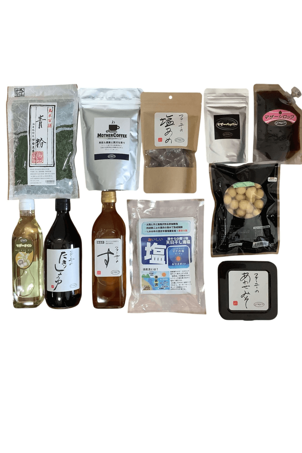 フォーユーのお好みセット。 おひさまソルト300g、米酢500ml、溜まり醤油500ml、合わせ味噌500g、きび糖シロップ150g、粗挽き塩胡椒60g、青粉20g、マカダミアナッツオイル270ml、塩あめ120g、マカダミアナッツボール75g、無農薬玄米コーヒー150g。